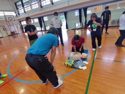 5月30日に,龍郷消防分署の方を講師にお招きし,AED講習会を行いました。希望するPTA保体部員の方や高学年の保護者,本校職員が参加し,子供への心肺蘇生法の仕方やAEDの正しい使い方などを学びました。