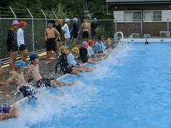 1年生は、だるま浮きやふし浮き、けのびなどの練習をしました。少ない練習期間でしたが、顔を水につけることが難しかった子ができるようになったり、けのびの練習を頑張って、5m泳げるようになったりと、みんな大きく成長しました。「夏休み、海に行って練習する。」と意気込んでいる子もいます。初めての水泳学習でしたが、みんなとても楽しかったようです。