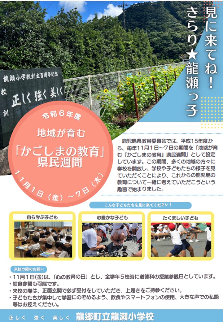 ホーム > くらし > 健康・福祉・子育て > 教育 > 小学校 > 龍瀬小学校 > 学校の様子 > 令和6年度 > 10月 > 地域が育む「かごしまの教育」県民週間in龍瀬小